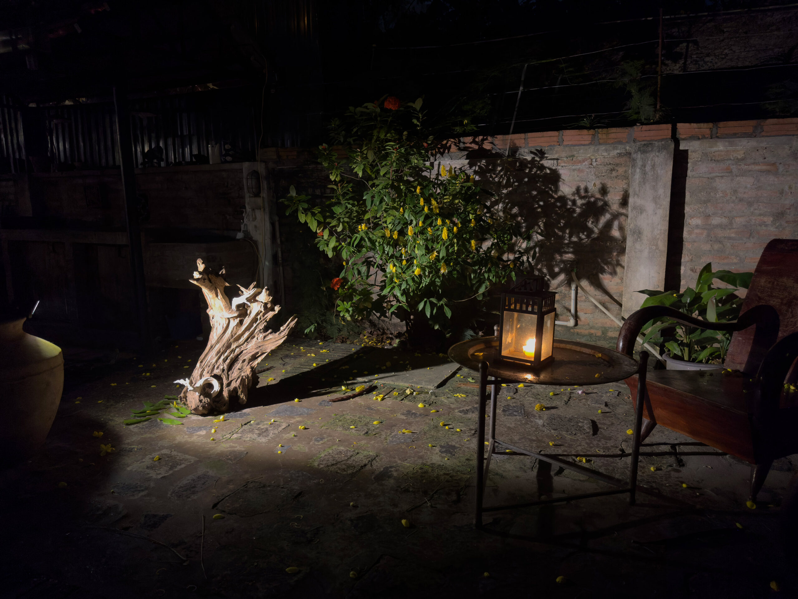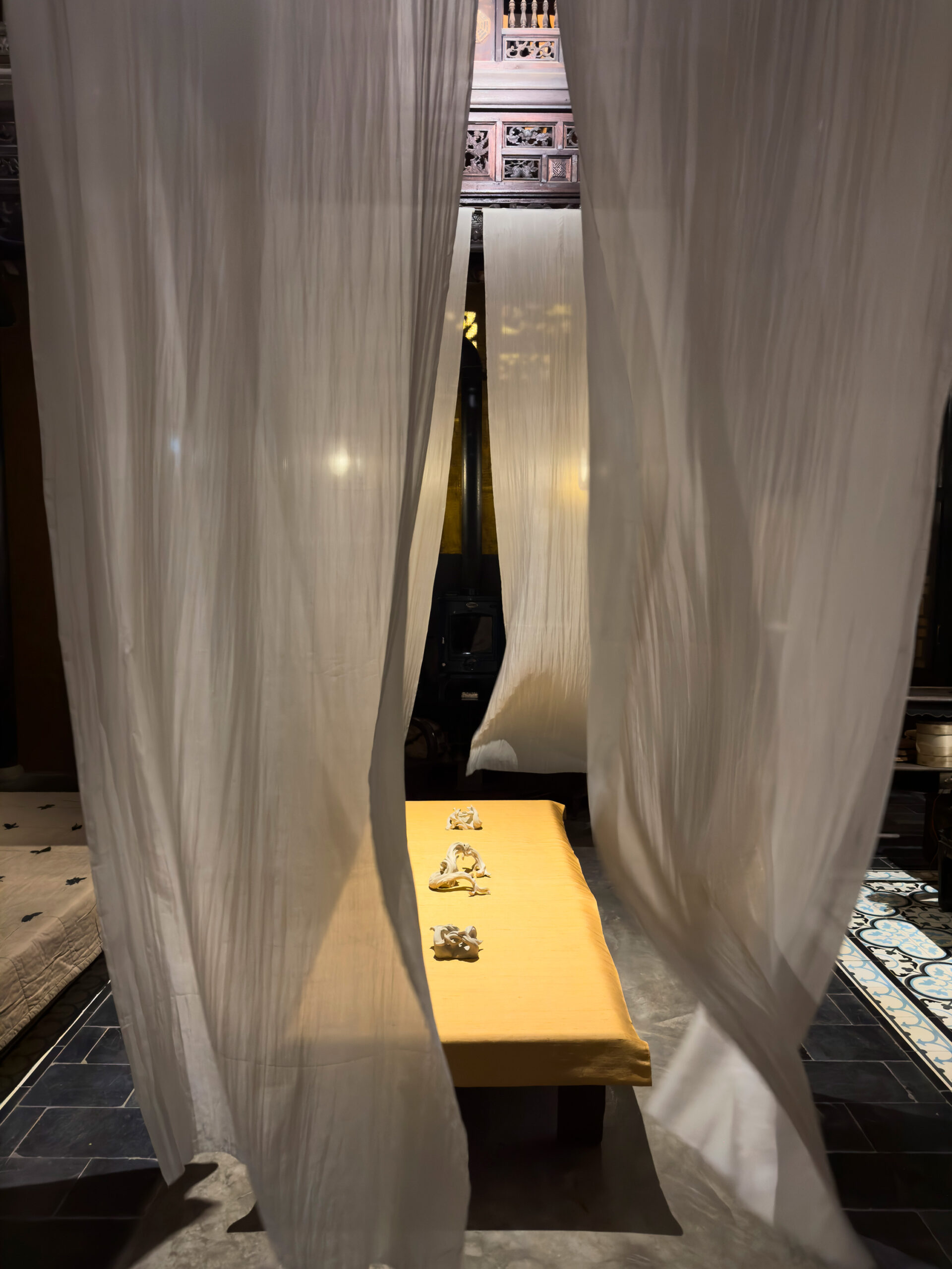 Ceramic sculptures, found wood, silk, light installation, 2023