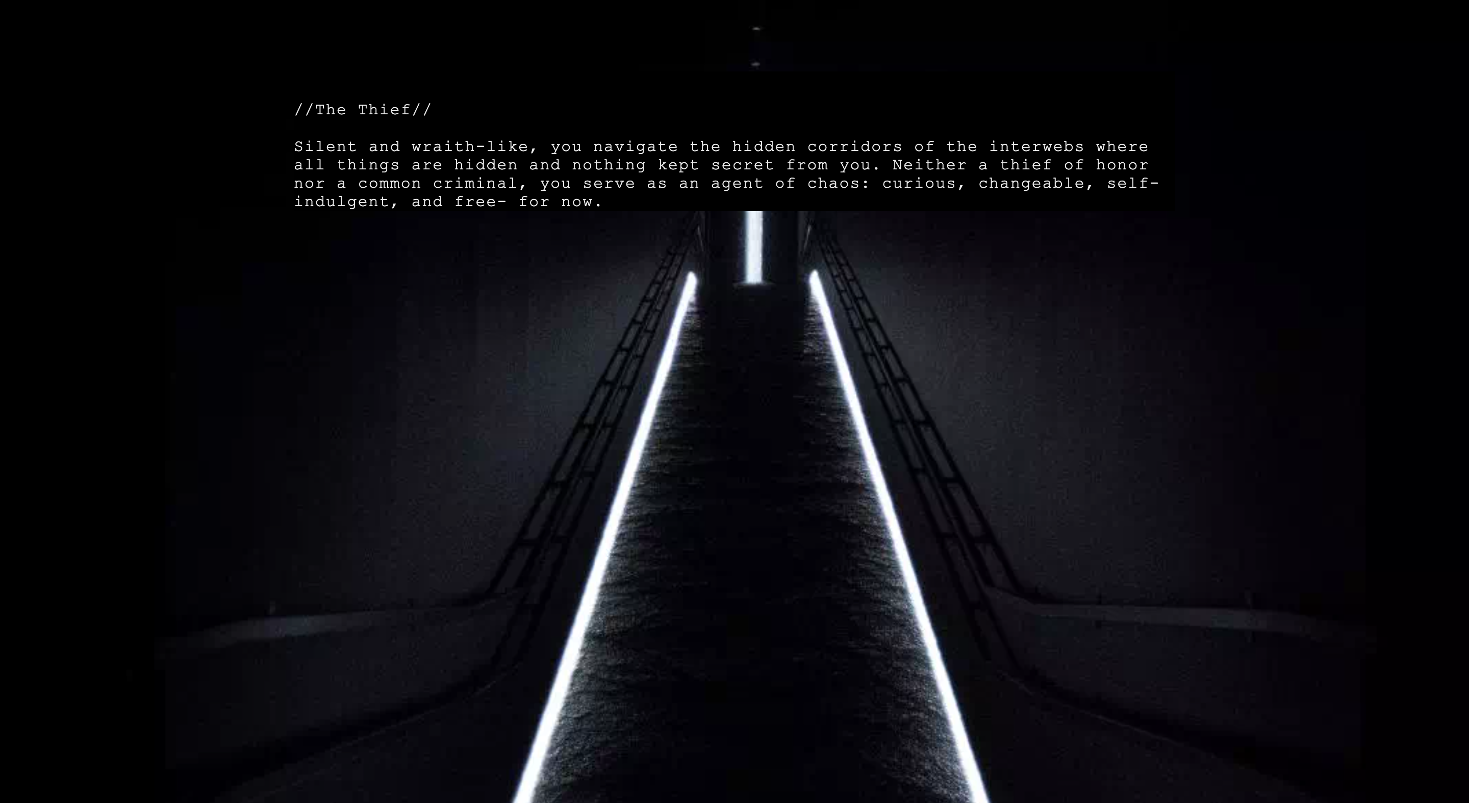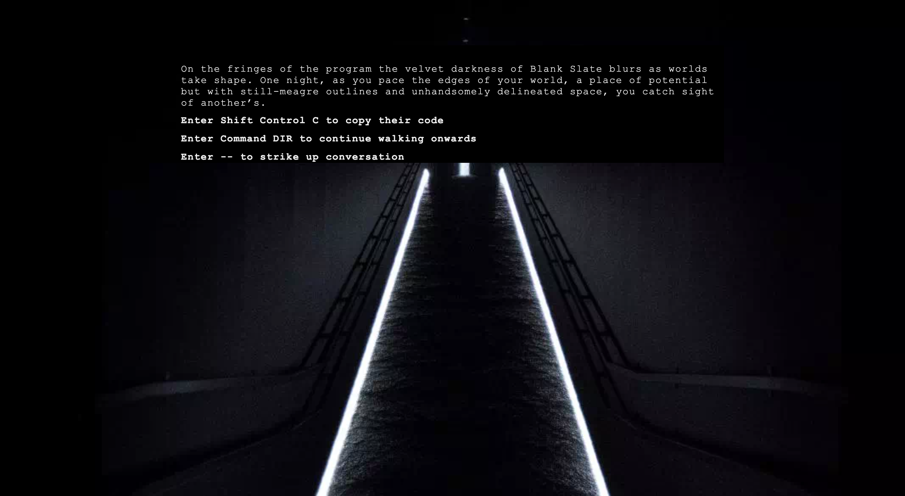 The fictional version of the web written for The Unknown Self is based on memories of the internet in the very earliest days of social media and before widespread digital surveillance. In that iteration of the internet one could be free in the darkness of night, lit by the pale luminance of a screen, and the imagined darkness of a less developed web, akin to an empty field—absent of many of the systems that have been virtually built up around us since then.